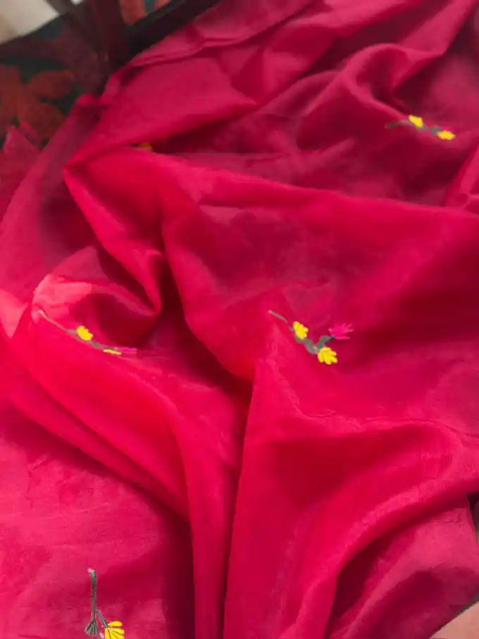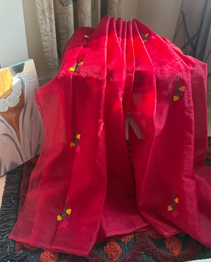 Perfect for weddings, receptions, Eid, Puja, parties, and festive gatherings, this organza saree blends modern elegance with traditional beauty. The airy texture combined with detailed embroidery makes it both stylish and comfortable to wear.