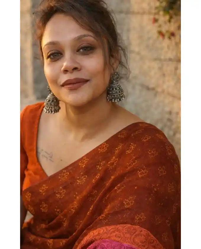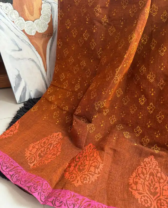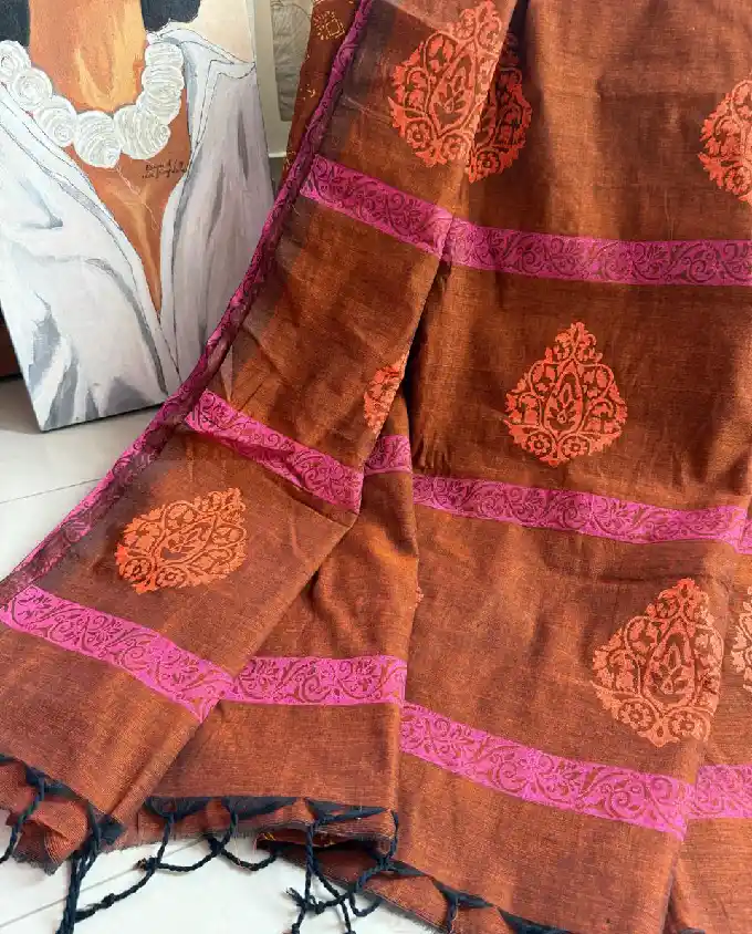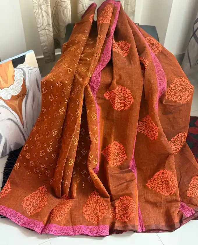 Designed in a traditional 14 haat length, this saree provides a fuller and more graceful drape, perfect for those who prefer a classic and generous wrap style. The beautiful block print work adds a touch of heritage charm, showcasing timeless patterns that reflect authentic craftsmanship. The balanced design keeps the look simple yet attractive.