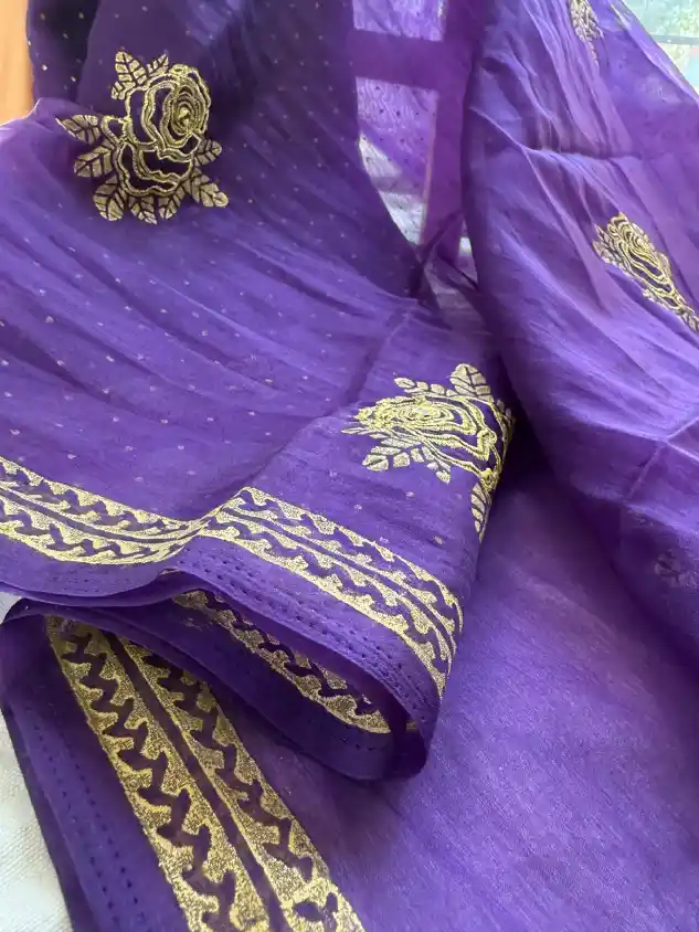 Designed in a traditional 14 haat length, this saree provides a fuller and more graceful drape, perfect for those who prefer a classic and generous wrap style. The beautiful block print work adds a touch of heritage charm, showcasing timeless patterns that reflect authentic craftsmanship. The balanced design keeps the look simple yet attractive.