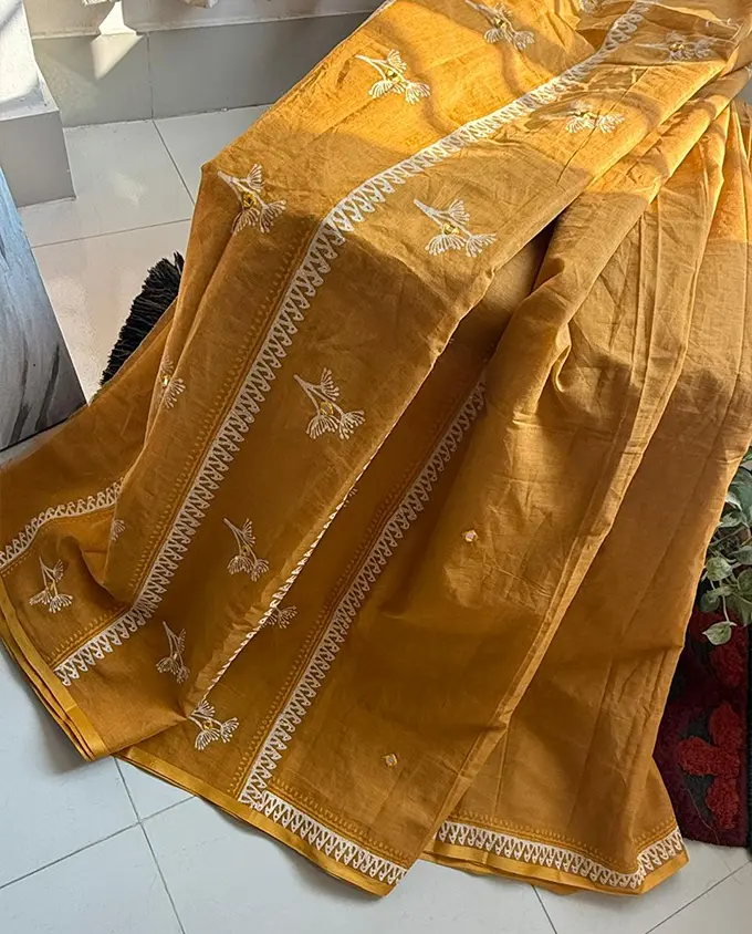 Designed in a traditional 14 haat length, this saree provides a fuller and more graceful drape, perfect for those who prefer a classic and generous wrap style. The beautiful block print work adds a touch of heritage charm, showcasing timeless patterns that reflect authentic craftsmanship. The balanced design keeps the look simple yet attractive.