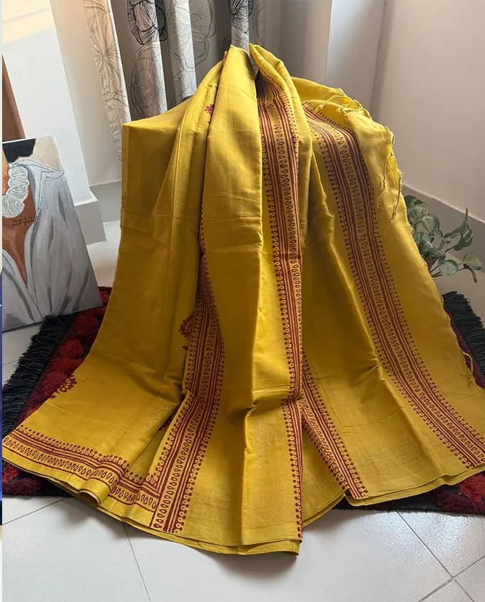 Designed in a traditional 14 haat length, this saree provides a fuller and more graceful drape, perfect for those who prefer a classic and generous wrap style. The beautiful block print work adds a touch of heritage charm, showcasing timeless patterns that reflect authentic craftsmanship. The balanced design keeps the look simple yet attractive.